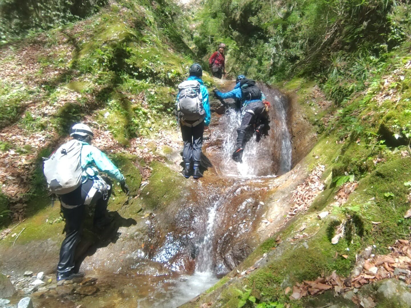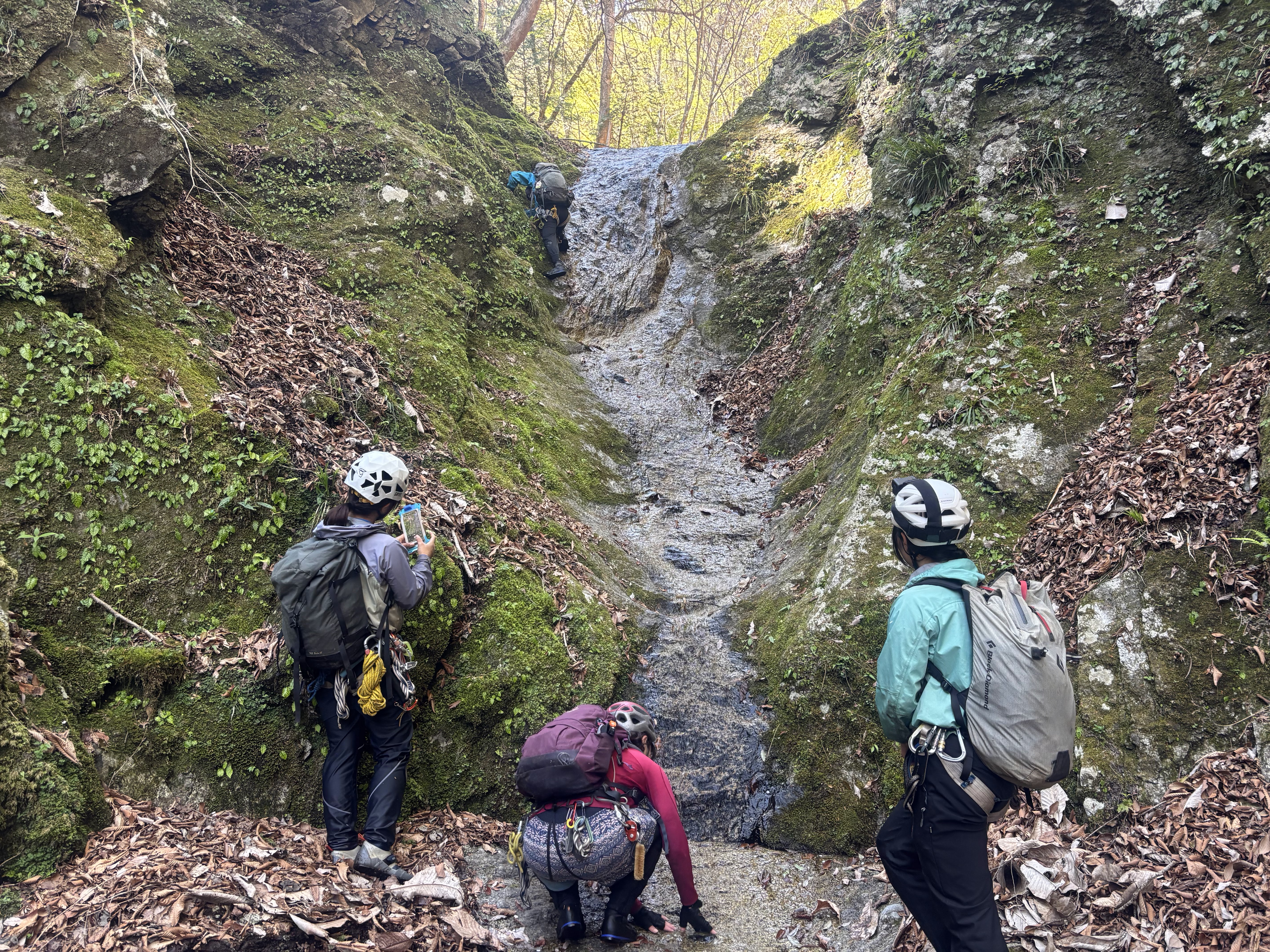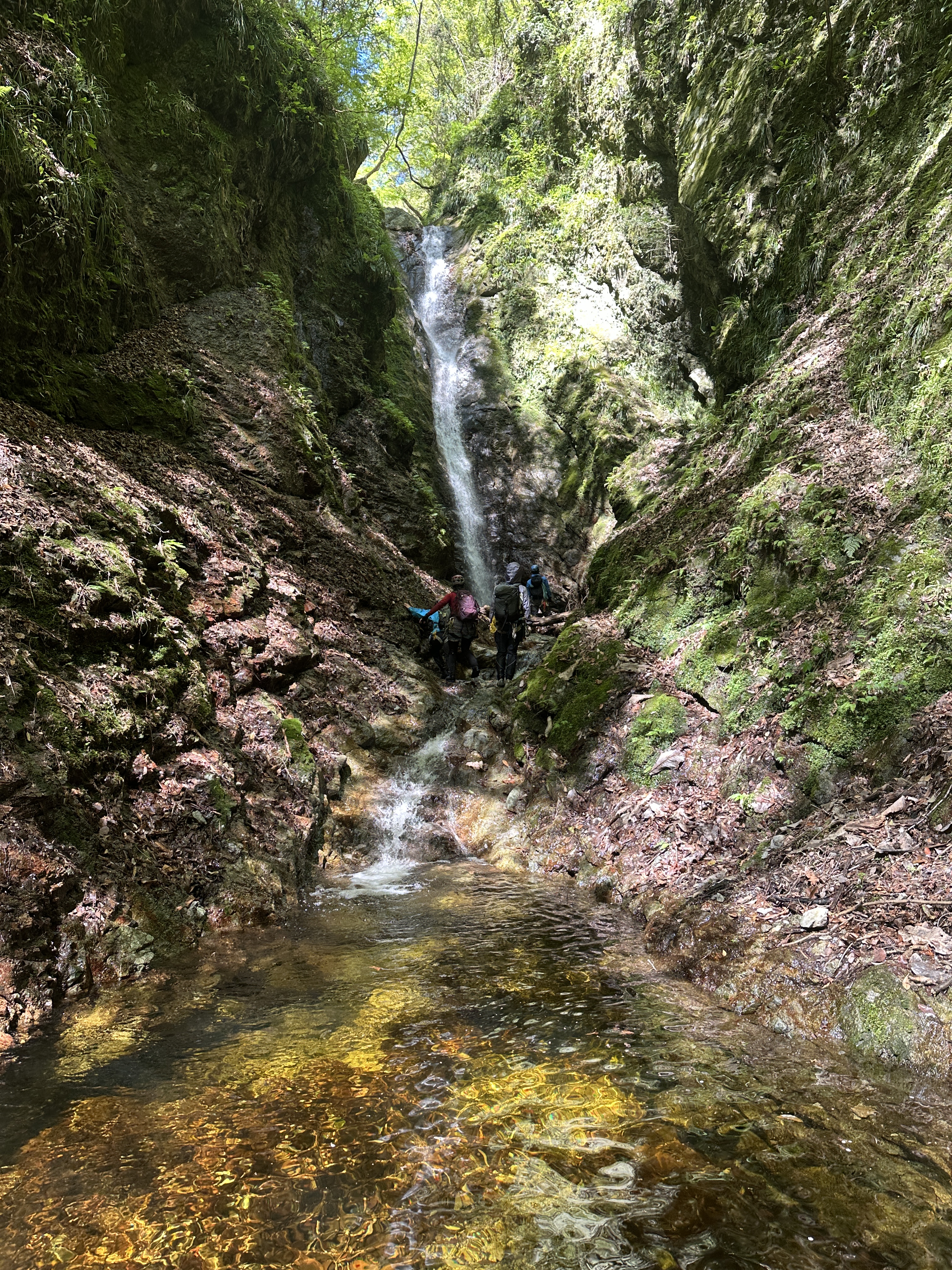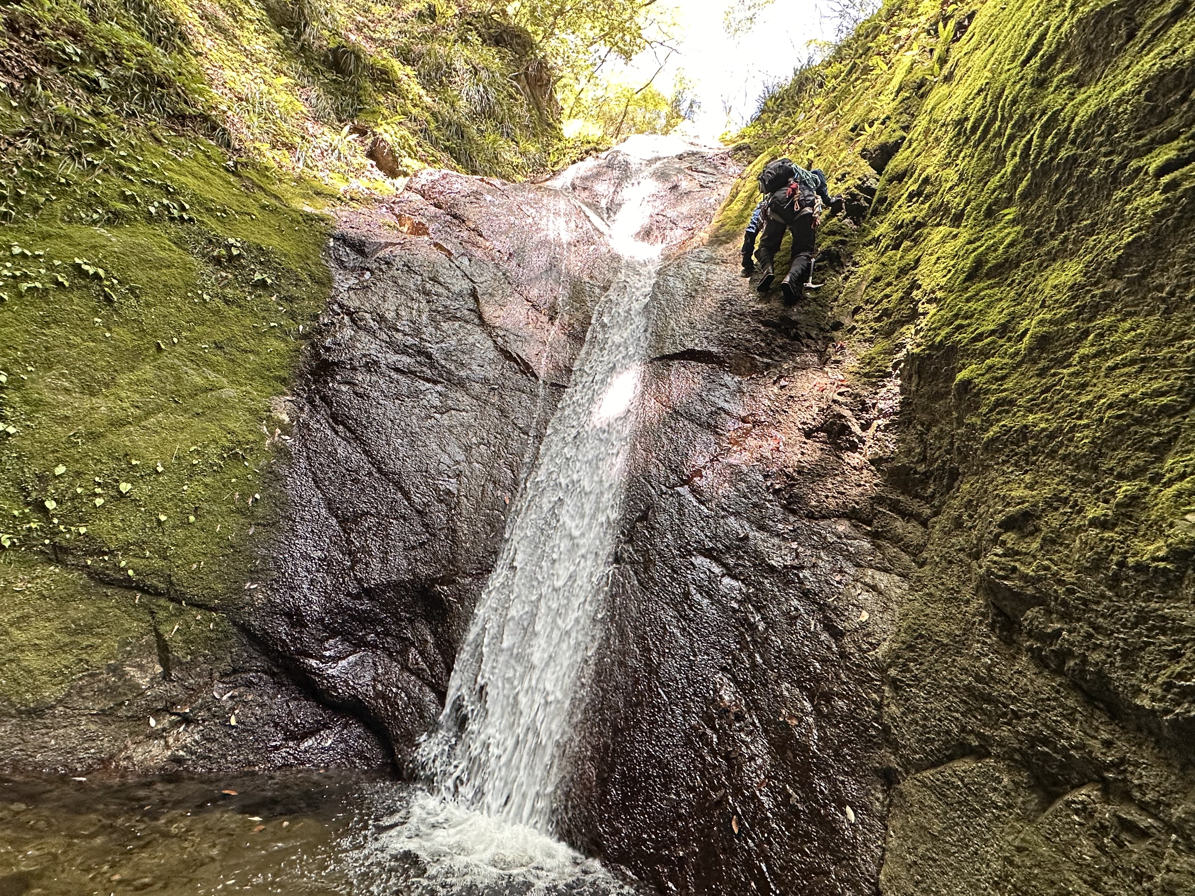 すぐに10m滝が出てくる。水流右を登れそうとのことで、たろうさんリードで登攀。