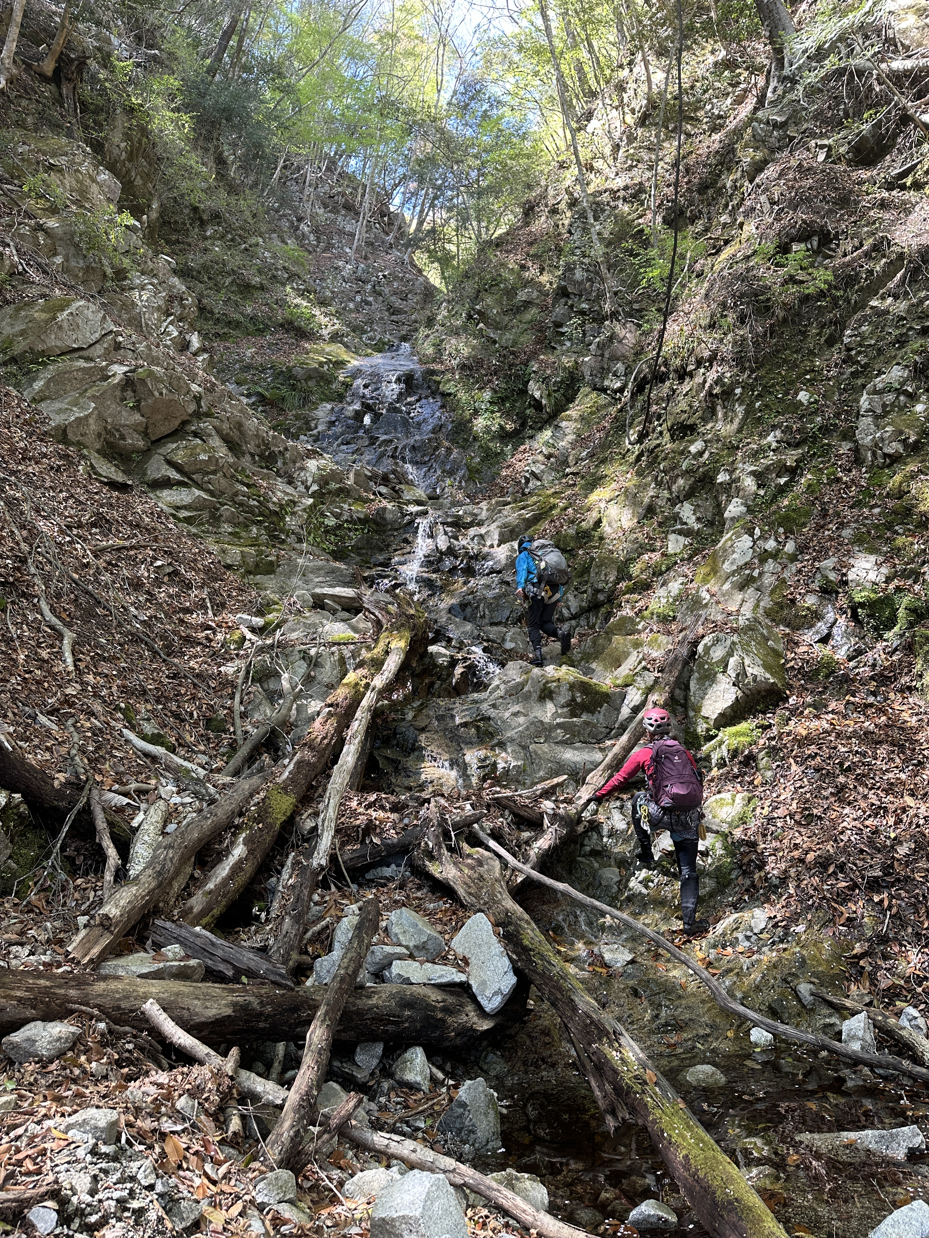 2段20mも左岸から高巻き。高巻きはザレザレだが残置ロープが設置されている。